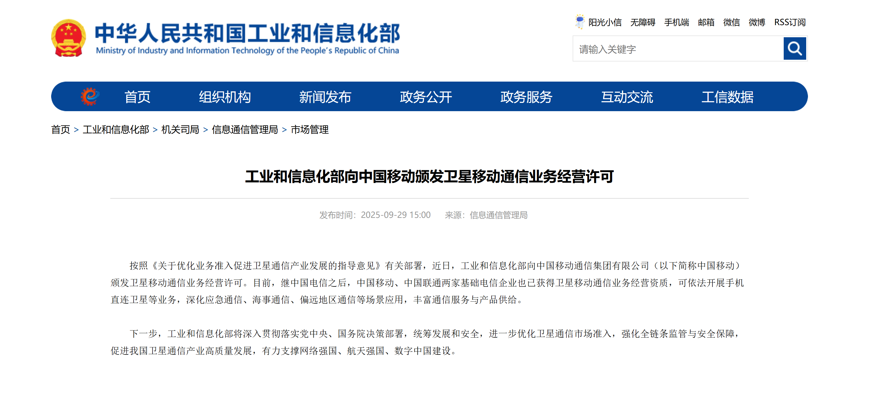 工信部向中国移动颁发卫星移动通信业务经营许可   工信部向中国移动颁发卫星移动通信业务经营许可