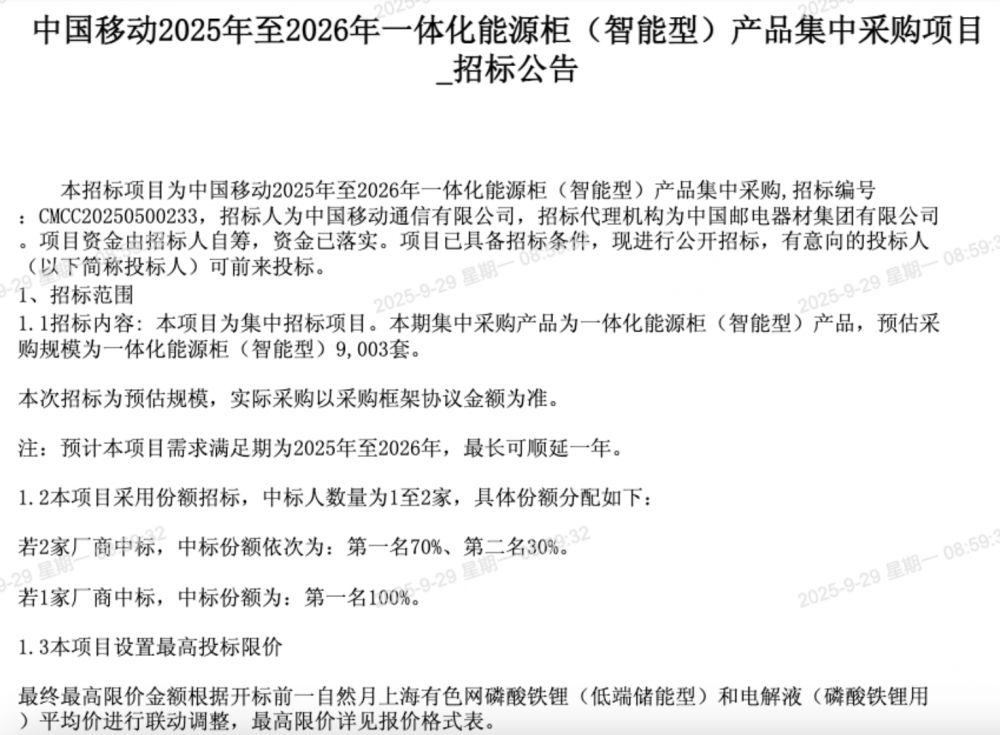 中国移动一体化能源柜(智能型)产品集采:规模为9003套   中国移动一体化能源柜(智能型)产品集采:规模为9003套