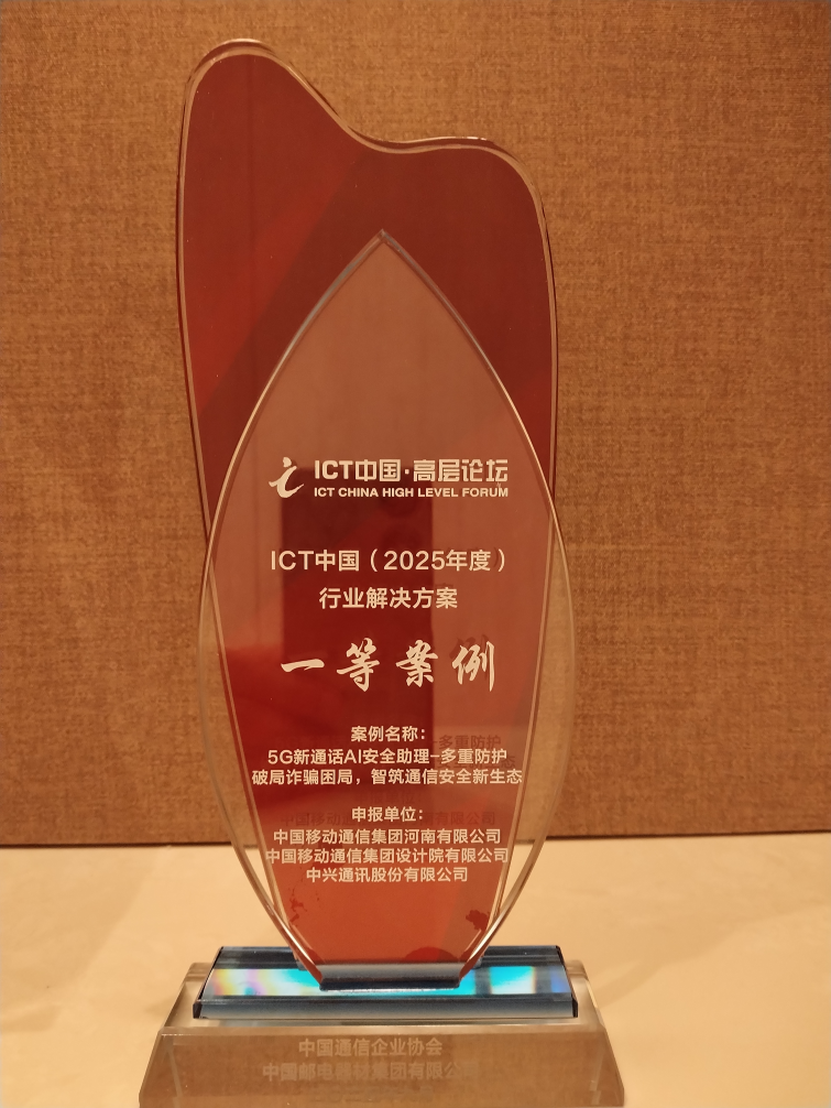 河南移动联合中兴通讯“5G新通话AI安全助理”荣获ICT中国(2025)案例一等奖   河南移动联合中兴通讯“5G新通话AI安全助理”荣获ICT中国(2025)案例一等奖