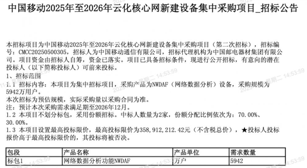 3.6亿元!中国移动启动云化核心网新建设备集采   3.6亿元!中国移动启动云化核心网新建设备集采
