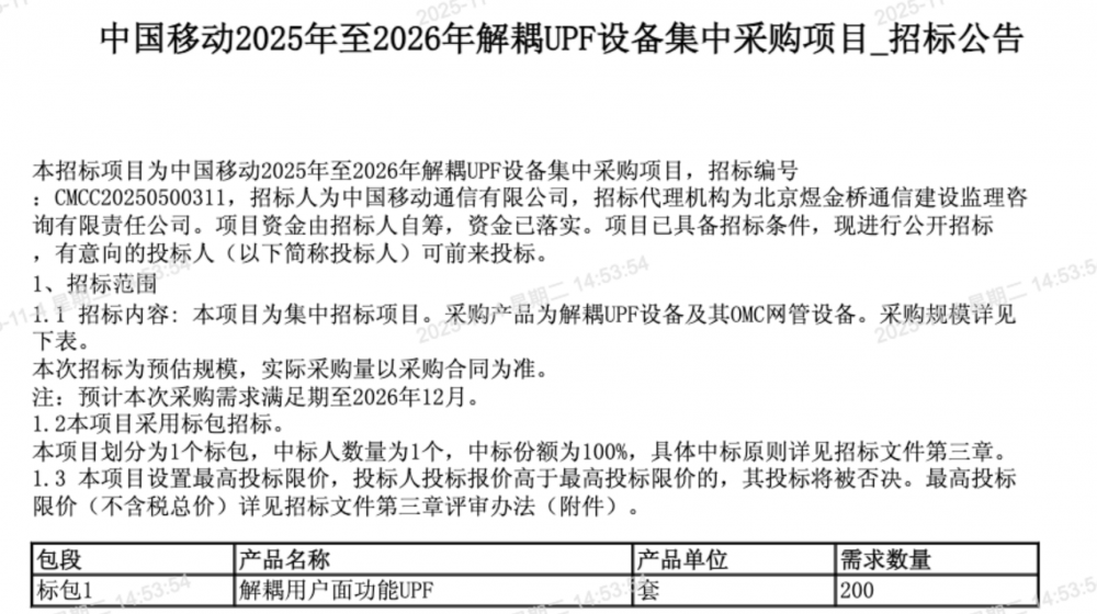 中国移动启动解耦UPF设备集采,规模为200套   中国移动启动解耦UPF设备集采,规模为200套
