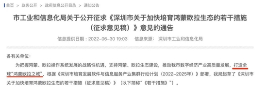6月30日,深圳市工业和信息化局发布了关于公开征求《深圳市关于加快培育鸿蒙欧拉生态的若干措施(征求意见稿)》(以下简称“《若干措施》”)意见的通告,提出要在深圳打造全球“鸿蒙欧拉之城”。
