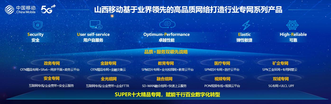 山西移动基于5G、OTN、SPN、SD-WAN等先进技术,倾力打造SUPER十大精品专网,依托于先进的全光网络技术,构筑“1-3-5”时延圈,旨在为客户提供高速、安全、自主运营的“连接服务”,打造一点接入、即取即用的“算力服务”,输出统一封装、灵活调用的“能力服务”。山西移动SUPER专网包含“政务专网、金融专网、医疗专网、教育专网、矿企专网、视频专网、安全专网、全光组网、融合组网、双域专网”等十大专网解决方案,以“安全、用户自服务、卓越性能、弹性敏捷、可靠”五大特性,为行业客户提供专属、定制、高品质的专网解决方案,满足客户更高品质的信息化需求。