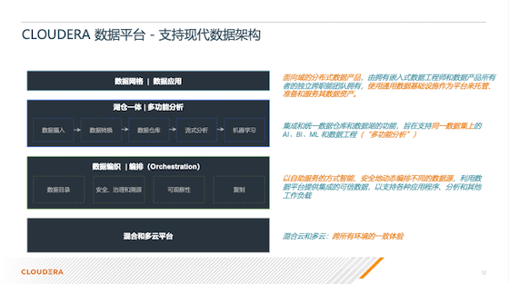 实际上,CDP(Cloudera Data Platform) 是业界唯一适用于数据编织、数据湖库、数据网格和未来数据生态系统架构要求的混合数据平台。 Cloudera的数据平台实现了对于现代数据架构的全面支持,产品技术能够适应数据网格、数据编织、湖仓一体这三种架构概念,同时在多云和本地部署上,都可以做到管理和分析。Cloudera的分析代码经过一次编写即可跨平台运行。另外,SDX还能够做到数据的统一安全管控和治理。