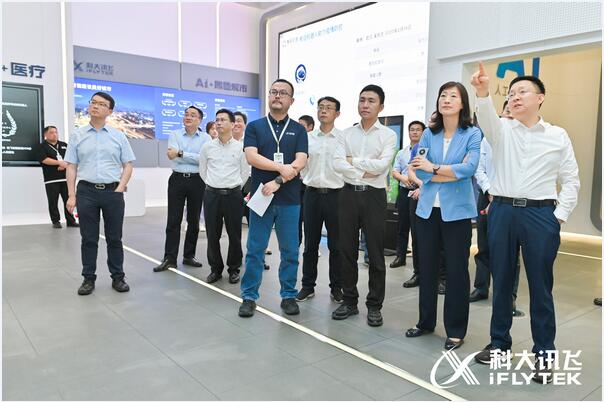 在科大讯飞人工智能体验厅,安徽电信党委书记、总经理刘颖一行详细了解了科大讯飞的发展历程及AI技术在教育、医疗、运营商、工业、办公等场景的应用。