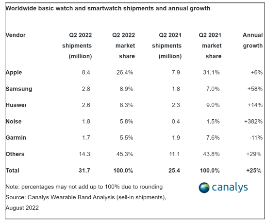 苹果继续以26%的市场份额主导全球手表市场。尽管备受期待的 Galaxy Watch 5 系列将于 2022 年第三季度推出,但三星智能手表出货量达到280 万台,以 58%的稳健增长超越华为。