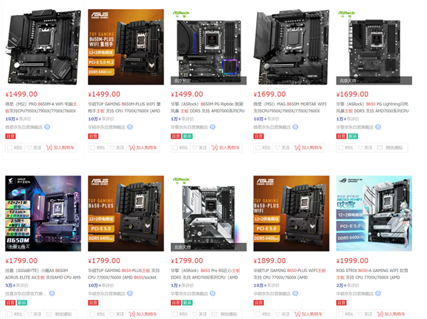 至于国内的价格,各大品牌的B650主板价格是1499元起,主力型号是1699-1899元了,如果是B650E芯片组的,价格普遍2000元起步,高端品牌的甚至做到了2399元以上。