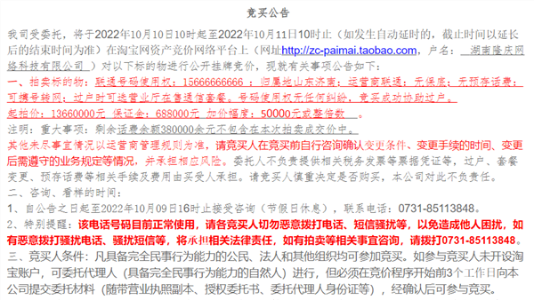 需要注意的是,这1366万的价格还只是拍得这个手机号,其中附带的话费余额380000(38万)余元,不包含在本次拍卖成交价中,需要在拍卖价之后额外支付话费金额。