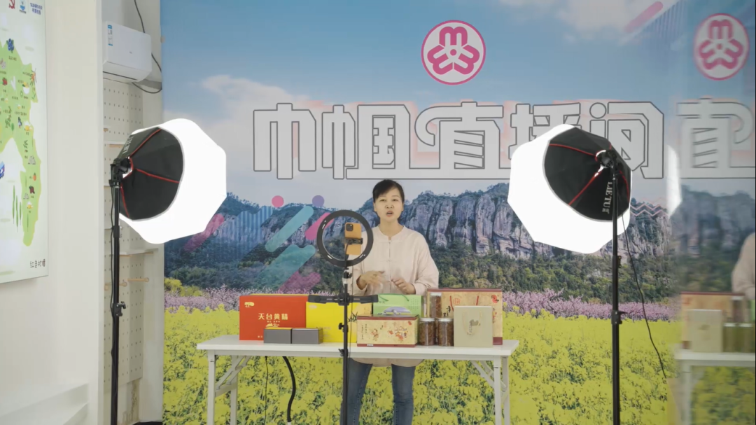 (后岸片区巾帼家门口创业圈负责人林晓静在直播间销售当地特产)