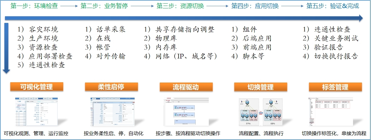 计费系统业务组网复杂,设备数量庞大,进程数量达到6万+,从生产中心切换到容灾中心涉及数据库切换、参数&配置文件修改、存储挂载、应用部署、应用启停等大量手工操作,步骤繁琐复杂,恢复时间目标(RTO)时长达数个小时,无法满足业务连续性要求。