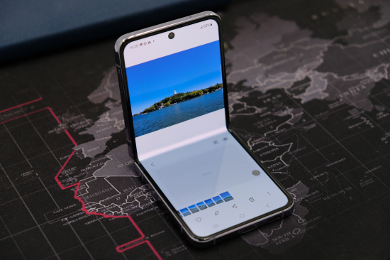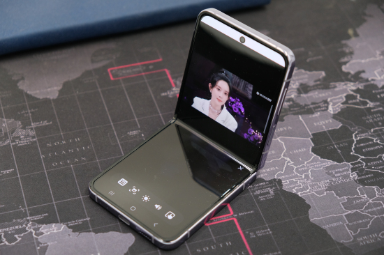 在三星 Galaxy Z Flip4 中,用户可以将手机折叠悬停在 75° 到 115° ,这也为用户打开了全新的立式交互模式。这时,大部分应用程序会调整为上半部分屏幕显示画面,下半屏幕为操作选项,以便于用户将手机立于桌面上使用。