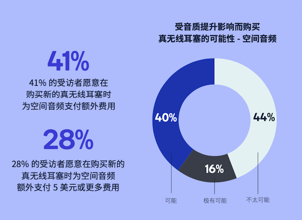 《音频产品使用现状调研报告2022》中显示,41%的受访者愿意在购买新的真无线耳机时为空间音频支付额外费用,28%受访者愿意为此额外支付5美元或更多费用。对于该功能的认知程度也不断提升,73%受访者表示知道这一功能,34%的受访者表示对空间音频功能十分熟悉。