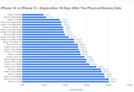 iPhone 14 VS iPhone 13发布后10天的贬值对比,图片来源:SellCell