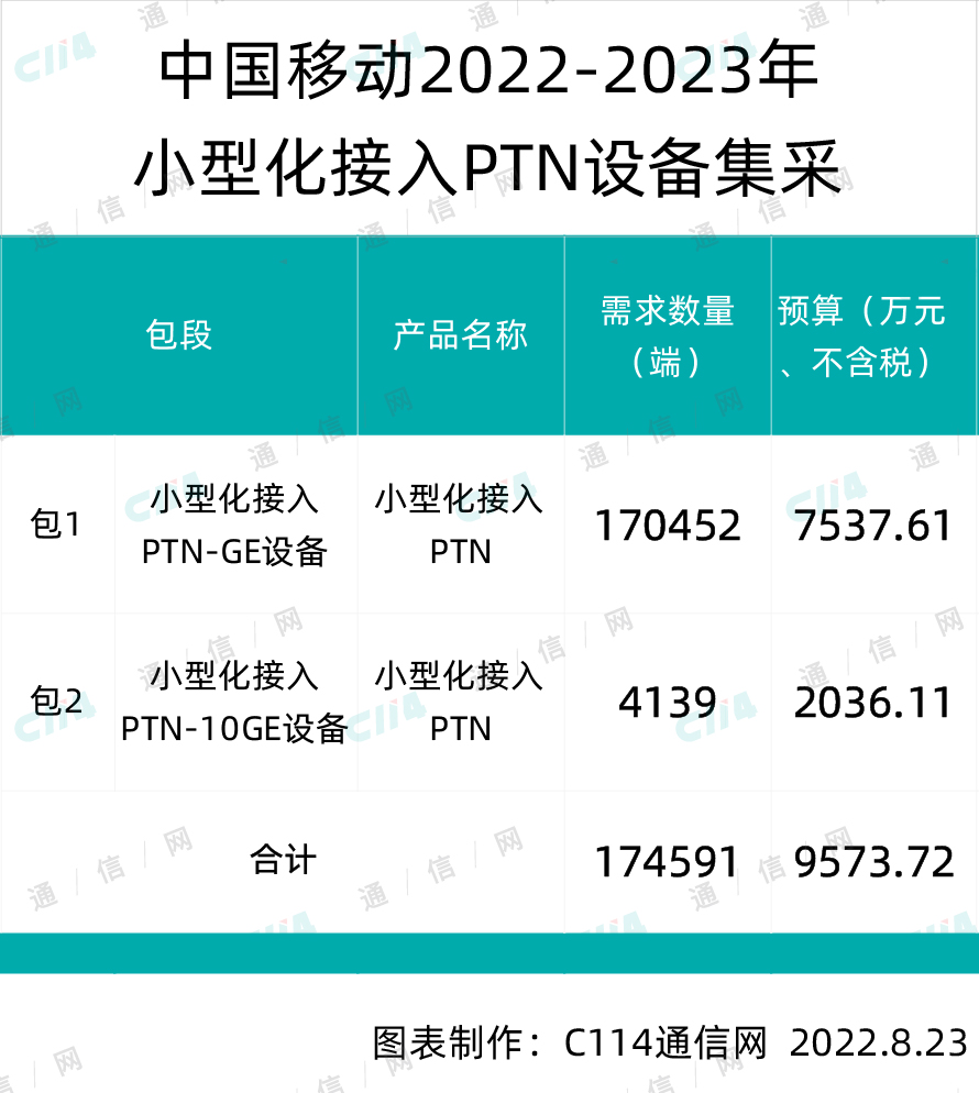 据中国移动此前发布的集采公告显示,本次预估采购小型化接入PTN设备17.46万端,项目总预算9573.72万元(不含税)。项目共划分为2个标包,具体标包划分及分配份额如下: