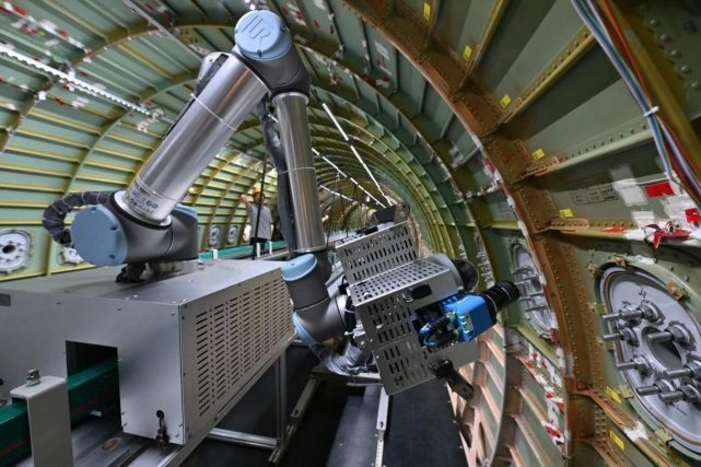 (中国飞机强度研究所上海分部大型客机全机静力/疲劳实验室内,数百个液压作动器和充压装置精准模拟着飞机服役状态下的受载。安装在机舱内导轨上的5G+AGV结构损伤巡检系统不受舱内气压影响,平稳地采集机舱内各项数据并回传至总指挥平台。这是中国移动打造的“5G+智慧航空强度试验”项目,为国产大飞机的机型强度试验的数字化转型注入5G新动能。)