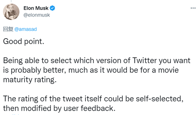 马斯克发推文称,希望用户可以选择自己想要的推特版本,就类似于电影分级制度,推特可以对推文进行评级,然后根据用户反馈进行修改。