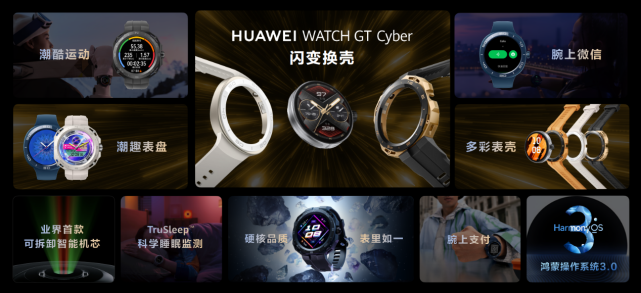 Cyber一词来源于赛博朋克,象征着科技时代的新趋势、新潮流,华为WATCH GT Cyber首创可拆卸智能机芯,闪换表壳设计,多款一体化表壳支持快拆闪换,用户只需双指按压即可实现机芯和表壳的分离,实现智能机芯的闪变换壳。无论是室内运动、工作娱乐还是出游,用户都可随心改变腕表风格,展现个性时尚感。正如华为终端业务COO 何刚所言:“HUAWEI WATCH GT Cyber可换壳智能潮表,让你戴的不止是一块智能手表,更是一款百变潮表!”