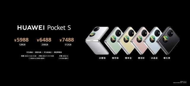 华为Pocket S 128GB售价5988元;256GB售价6488元;将于2022年11月2日21:08在华为商城、各大授权电商、华为体验店、授权零售商开启预售,2022年11月10日10:08正式开售。华为Pocket S 512GB售价7488元,将于2022年12月正式开售。