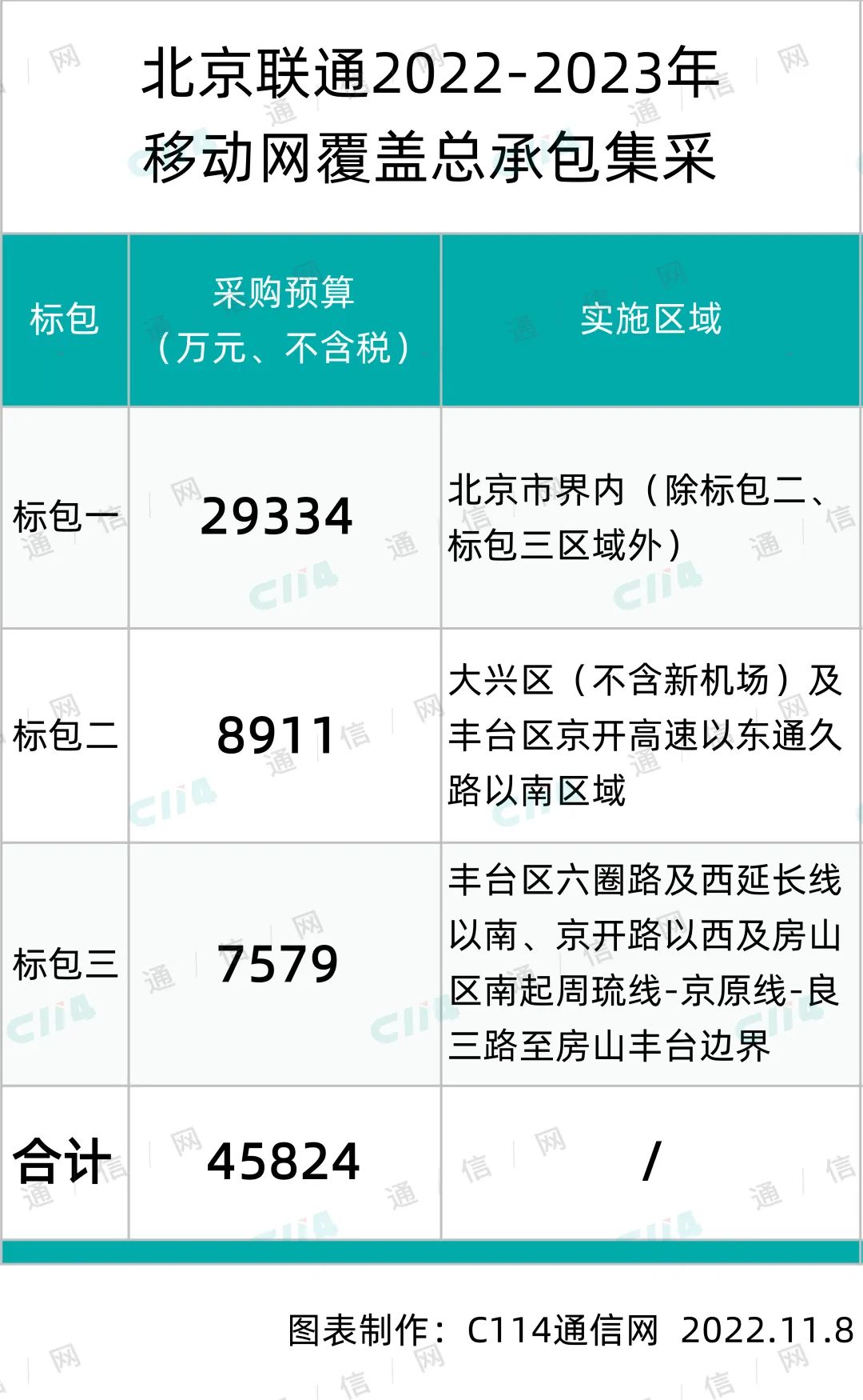 据此前北京联通发布的招标公告显示,本次采购主要针对北京分公司室内外无线网新建、扩容、改造的施工和设计总承包服务及同步现场相关优化服务(含部分乙供天线、器件、配套设施,不含空调、电池),室分部分(新型室分以及涉及纯信源升级改造的室分)包含进场协调、协助招标方与业主完成签订《无线网络覆盖协议》等工作。本项目为投资类项目,工程总投资预算为45,824.00万元人民币(不含增值税金额)。