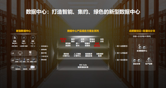 首先我们介绍一下数据中心产品组合方案。数据中心是海量数据处理的基石,是数字基础设施的核心。它聚合服务器、存储、网络、HCS、能源、散热系统等多个产品,具有多样性算力、数网协同、融合灾备、一体化安全、绿色低碳等先进特性,推动传统DC向智能、集约、绿色的新型DC演进。