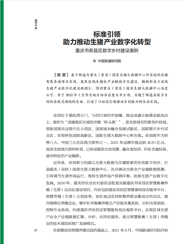 研究院团队积极响应国家“加强数字乡村标准化建设”的要求,协助推动重庆(荣昌)国家生猪大数据中心生猪智慧养殖项目实践形成地方标准,促进生猪产业数字化转型,打造了以标准引领推动数字乡村发展的生动实践。研究院团队充分运用现场调研、资料研读、远程会议讨论、专家意见征询等方式,聚焦区域生猪全产业链数字化需求和建设方案,编制形成《生猪智慧养殖建设规程》。2022年3月,以该规程为基础申报的生猪智慧养殖地方标准被正式列入《2022年第一批重庆市地方标准制修订计划项目》编制目录,成为地方标准后将在推动区域生猪全行业智慧养殖建设实施上发挥更大作用,更好地助力生猪产业数字化转型。该项工作实现了联通在数字乡村标准规范领域的突破,案例成功入选2022年《中国联通数字乡村案例汇编》。