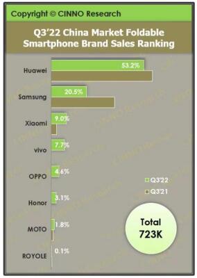 据央视财经报道,2022年上半年,国内折叠屏手机出货量超过110万部,同比增长70%;2022年第三季度,折叠屏手机出货量超过100万台,同比增幅246%,创有史以来最大单季出货量。CINNO Research数据显示,2022年第三季度,华为折叠屏手机销售同比增长95%,市场份额53.2%,首款小折叠手机华为P50 Pocket上市以来,已连续三个季度蝉联国内折叠屏手机销量冠军。可以预见的是,随着华为Pocket S的上市开售,华为将会继续领跑折叠屏手机市场。拥有时尚多彩外观,售价更加亲民的华为Pocket S或将成为最畅销的小折叠屏手机。