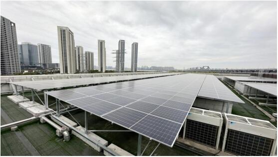 近年来,浙江绿色能源比例迅速提升。毗邻杭州亚运村的电力能源碳中和技术示范基地,屋顶被一大片光伏板覆盖着,旁边还有两台风力发电机在迅速运转。这些屋顶光伏以及风力发电实现年度发电量超百万千瓦时,可满足亚运村区域的智慧路灯、园区内的数据中心等设备设施的用电需求。