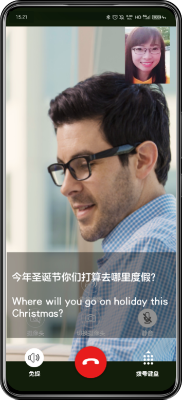 无障碍业务,可以将视频通话中话音转换成文字,或对话音内容进行翻译,并以字幕形式实时叠加到视频上,为听力下降、视力不好的人群以及跨语言沟通有困难的人士提供温暖的人文关怀,实现无障沟通。