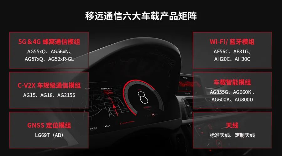 在车载领域,移远通信作为行业领先的物联网和车联网解决方案供应商,入局智能汽车已7年有余,在产品层面实现技术断崖式领先。目前已拥有完善的车规级产品线,涵盖车规级5G NR、LTE/LTE-A、C-V2X、智能模组、Wi-Fi/BT、GNSS、天线产品等组合,不断满足全球OEM客户和Tier 1合作伙伴的技术需求。如在智能座舱领域,移远通信推出AG855G智能模组,实现了汽车座舱的“算力赛”升级;在5G+V2X领域,车规级模组AG55xQ系列早在长城汽车第三代哈弗H6、WEY品牌摩卡、华人运通高合HiPhi X、理想L9等车型中陆续实现量产落地。