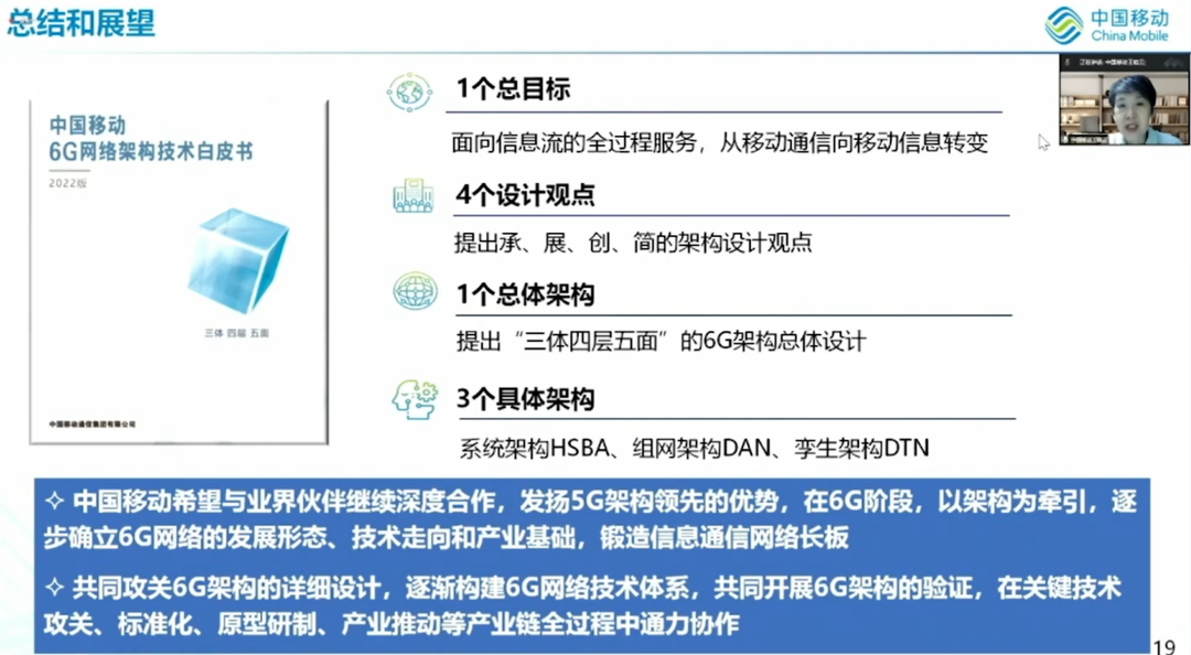 中国移动技术部总经理王晓云在主论坛视频演讲中表示,6G的总体目标是面向信息流的全过程服务,从移动通信向移动信息转变。中国移动进而提出承、展、创、简的6G设计观点,三体四层五面的6G总体架构,以及系统架构HSBA、组网架构DAN和孪生架构DTN三个具体架构。