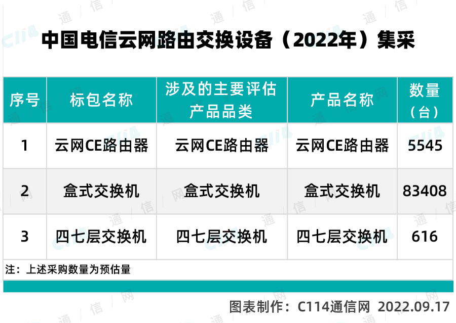 今年9月,中国电信云网路由交换设备(2022年)集采项目进行了首批集采,划分3个标包,分别为云网CE路由器标包、盒式交换机标包和四七层交换机标包。预估采购量分别为5545台,83408台,616台,总计89569台。