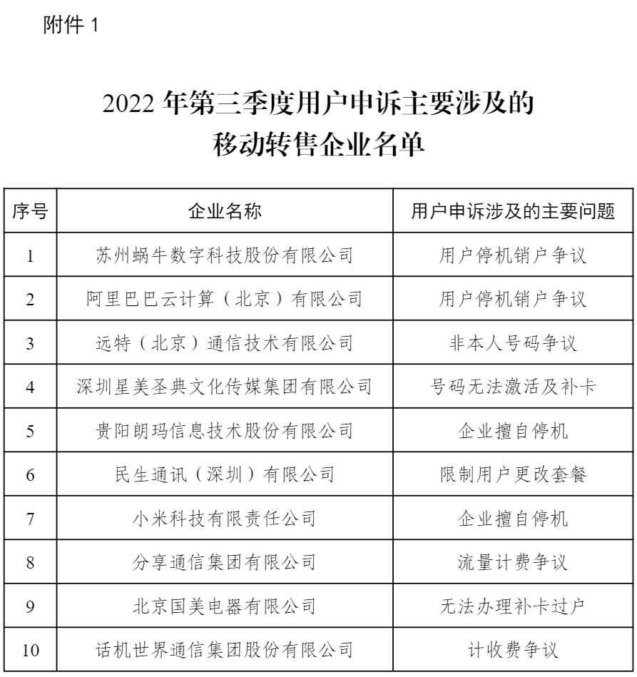 1. 2022年第三季度用户申诉主要涉及的移动转售企业名单