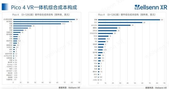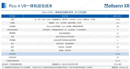 Wellsenn XR的拆机报告还显示,PICO的128G版本税后折合人民币成本为2913元,而这款机器的官方售价为2499元。也就是说,PICO的每一款机器,单从硬件售价来看就补贴了超过400元。