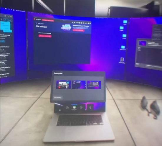 不论是PICO还是Meta,他们对于VR的终极设想都是下一代计算平台:在未来,VR不只是娱乐,可能是生活与办公必要的设备。这次的Quest Pro具备的MR(混合现实)功能可以让用户在使用Mac电脑时,在空中同时显示三个屏幕。根据国外科技博主Marques Brownlee所展示的效果,MR功能将虚拟画面与现实画面相融合,打破以往VR与现实完全割裂的限制。
