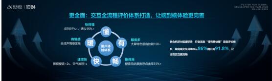 其三,交互全流程评价体系打造,让端到端体验更完善。针对平台交互评价标准,科大讯飞联合中国移动智慧家庭运营中心和福建移动分公司,在iFLYHOME OS首发“懂有畅快暖”语音评价体系,不同于现有行业通用的识别率、语义分析等偏技术化和分段碎片化的评价体系。iFLYHOME OS 2.0聚焦家庭用户交互全流程,从用户语音需求出发,注重整体体验感的提升,从单一搜索服务扩充到全场景交互服务,为家庭用户带来更人性化的智能操控体验,获取信息更快、更准、更智能。将端到端交互成功率提升到90%以上,为行业平台交互应用提供标准参考。