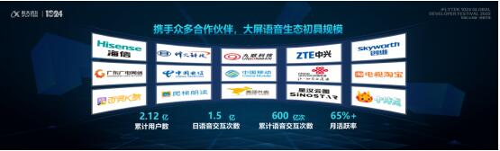 首先来看一组数据,当前讯飞和国内的主流运营商、互联网电视厂商,以及很多的智能终端合作伙伴一起携手合作,把整个iFLYHOME OS推向了千家万户。截止到今年11月,在电视端累计的语音用户数超过2.1亿,日语音交互次数达到1.5亿,累计语音交互次数突破600亿次。正是因为合作伙伴与讯飞的共同努力推动,应该说中国的电视大屏正式迈入了语音交互时代。