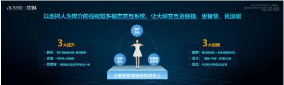 在业界,讯飞第一个将以虚拟人为媒介的强视觉多模态交互系统搬上电视大屏。它相对于传统的人机交互,在能听、会说、使用效果层面上得到了极大的提升,同时我们也把能聊、会认、安全等更大的创新功能能力叠加到了iFLYHOME OS 2.0当中,使得我们的大屏虚拟人真正能做到“能听会说、能看会认、能理解会思考”。