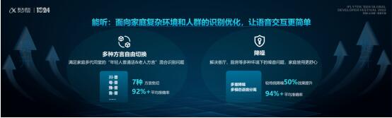 另一个大幅度的能力提升是降噪,一旦把远场识别功能加入了,在客厅环境下它有很多复杂的噪声,包括电视机声音、厨房声音以及家里电器的声音,有人说一用扫地机器人,语音识别就不行了,因为它太吵了。讯飞使用最新的多模降噪技术,把多模态的语音进行合理分离,充分解决了在客厅场景下这种复杂噪音的问题,较传统的降噪有50%的效果提升,94%的平均准确率,使得我们远场交互真正在家庭场景下能够得到使用,使得家庭使用更舒心。