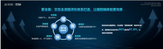 设备能听会说,不代表它能懂,我们觉得如何让用户有更好的体验,我们在2019年联合杭研、福建移动在行业首发了一套基于大屏的人机交互评价体系和标准,我们叫“懂有畅快暖”用户体验体系。这个体系一提出,得到了很多行业人士的认可,端到端的交互成功率从86%提升到91.8%,让端到端的服务体验更加完善。