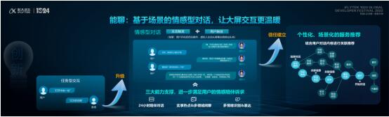 所以在新一代的人机交互当中,把讯飞最先进的情感型对话纳入了2.0系统,它可以通过机器人的多情绪识别表达,让现在的虚拟人具备实时新闻热点能力,具备文学、历史知识,也具备政治、军事知识,可以跟大屏前的用户做多场景下的复杂对话。而且这个功能有一个非常大的拓展,人一旦和虚拟人建立了信任、情感之后,我们就可以基于这种情感式的对话,挖掘更多的基于用户在内容上的个性化、场景化的服务推荐和需求,这项功能也会开放给所有的运营商、服务合作伙伴。