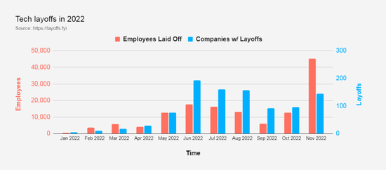 据Layoffs.fyi,今年11月到目前为止,科技行业裁员人数比今年任何其他月份都多,145家不同的科技公司有超4.5万名员工失业。