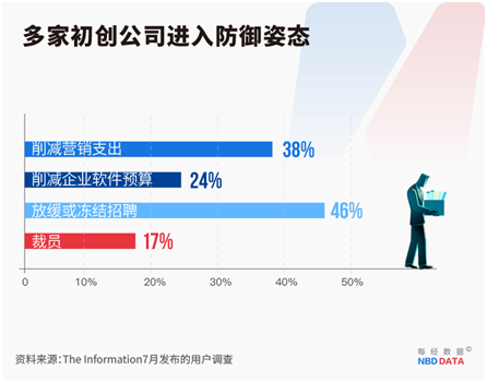 与科技巨头相同,初创公司们也正以更加防御的姿态来应对市场波动。2022年7月,外媒The Information发布的用户调查显示,38%的受访公司正在削减营销支出,24%正在削减企业软件预算,46%放缓了招聘或冻结招聘,17%正在进行裁员。