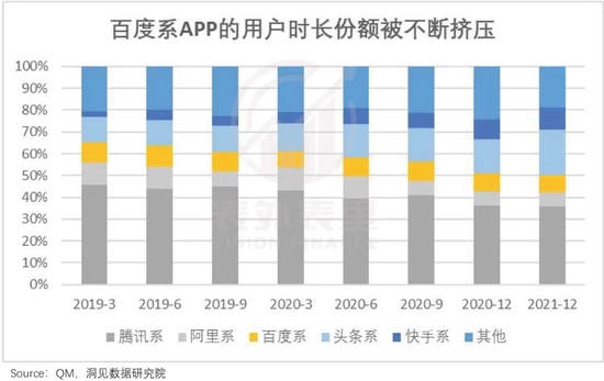 可以看到,在短视频冲击下,百度系APP的用户时长份额,持续下滑。