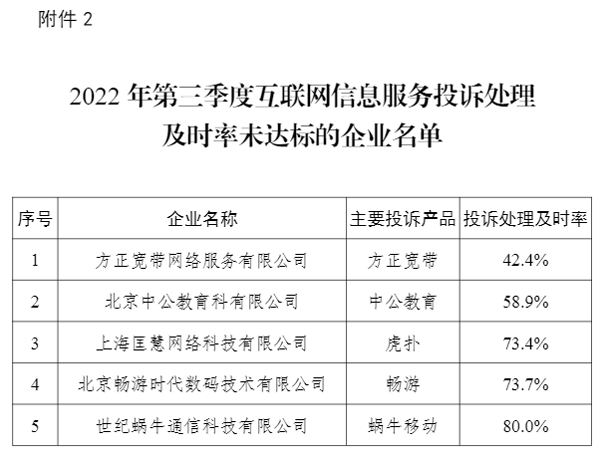 在互联网信息服务投诉方面,2022年第三季度,互联网信息服务投诉平台共收到互联网用户投诉39.36万件。其中,客服渠道类投诉17.01万件,占比43.2%;服务功能类投诉15.50万件,占比39.4%;个人信息保护类投诉3.92万件,占比10.0%;其他类投诉2.93万件,占比 7.4%。在接入平台的150家互联网企业中,方正宽带、中公教育、虎扑等5家企业投诉处理及时率未达到95%的指标要求,小红书、同程艺龙、贝壳找房、去哪儿网等投诉量增长较快,工信部已督促相关企业改进服务,解决用户反映的问题。