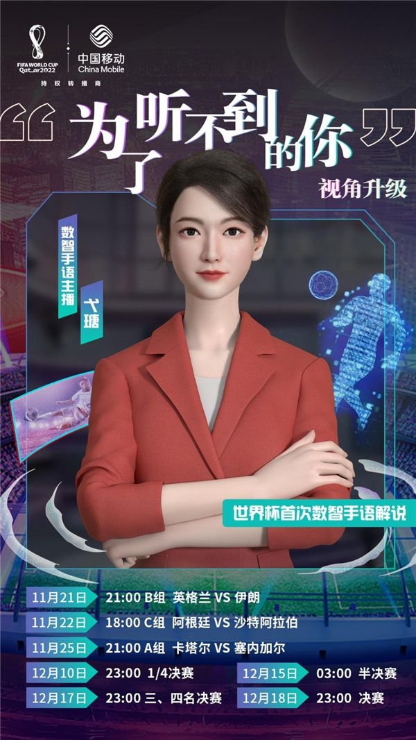此次“为了听不到的你”视角升级加入了中国移动的数智手语主播弋瑭。弋瑭借助基于深度神经网络的自然语言处理、高逼真度3D渲染、行业手语语料库、融合手语知识的翻译模型等技术,让更多人感受绿茵场上的赛事激情。据介绍,世界杯期间弋瑭将携手清华虚拟学生华同学,为听障人士带来10场专业准确的手语解说。