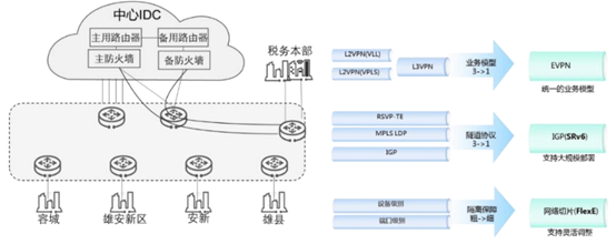基于FlexE和SRv6技术打造的新型综合承载网络,在业务层面实现了模型统一,通过EVPN业务方案整合了原有分散的VLL、VPLS及L3VPN业务,简化了业务层协议;在网络层面通过SRv6协议整合了原有复杂的IGP、BGP、LDP、MPLS及RSVP等隧道相关协议,实现了网络层面的简化;在产品层面通过FlexE技术实现了灵活的以太网分片功能,支持提供差异化保障的新型专线产品。通过上述技术方案的综合应用,实现了智慧政务场景下智能专线及专网产品的差异化服务,更好地适应了业务部署的分布式趋势。
