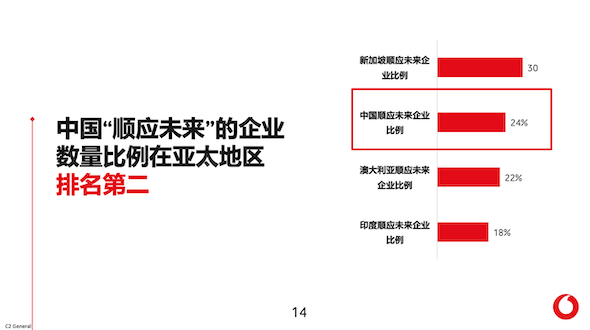 目前,中国“顺应未来”的企业数量比例达到了24%,位列亚太区第二名,落后于企业比例为30%的新加坡,另外澳大利亚的企业比例为22%,印度的企业比例为18%。不过需要注意的是,《顺应未来》 亚太报告中也显示,自2019年以来,中国与澳大利亚的“顺应未来”企业数量比例略有下滑,而印度则保持稳定。