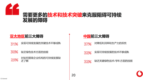 报告同时也指出了目前存在的障碍,实现可持续发展的关键技术不够成熟(31%)、缺乏绿色技术方面的技能(30%)、对如何提高企业机构的可持续发展缺乏了解(29%)成为了亚太地区的前三大障碍;对降低利润率和生产力的担忧(37%)、实现可持续发展的技术不够成熟(32%)、缺乏关键绿色技术/学科方面的技能(32%)成为了中国企业的前三大障碍。
