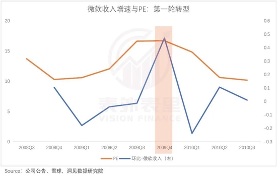 第一轮移动化转型,靠移动端Bing搜索、win7系统畅销以及宏大叙述Windows phone故事,2009Q4收入环比增长47%,叠加大规模削减成本,阶段被低估的股价以及庞大的资金流,这让华尔街认为,微软股价会持续上扬。