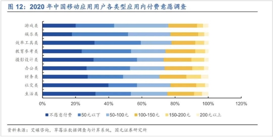 艾媒咨询调研显示,用户为效率工具类、办公类软件付费的意愿较低。如下图,30%-40%的用户不愿意付费;而愿意付费的用户,付费金额也较低。